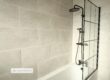 Brand new fitted bathroom suite with soft grey tiles and modern Matt black bathroom fittings.