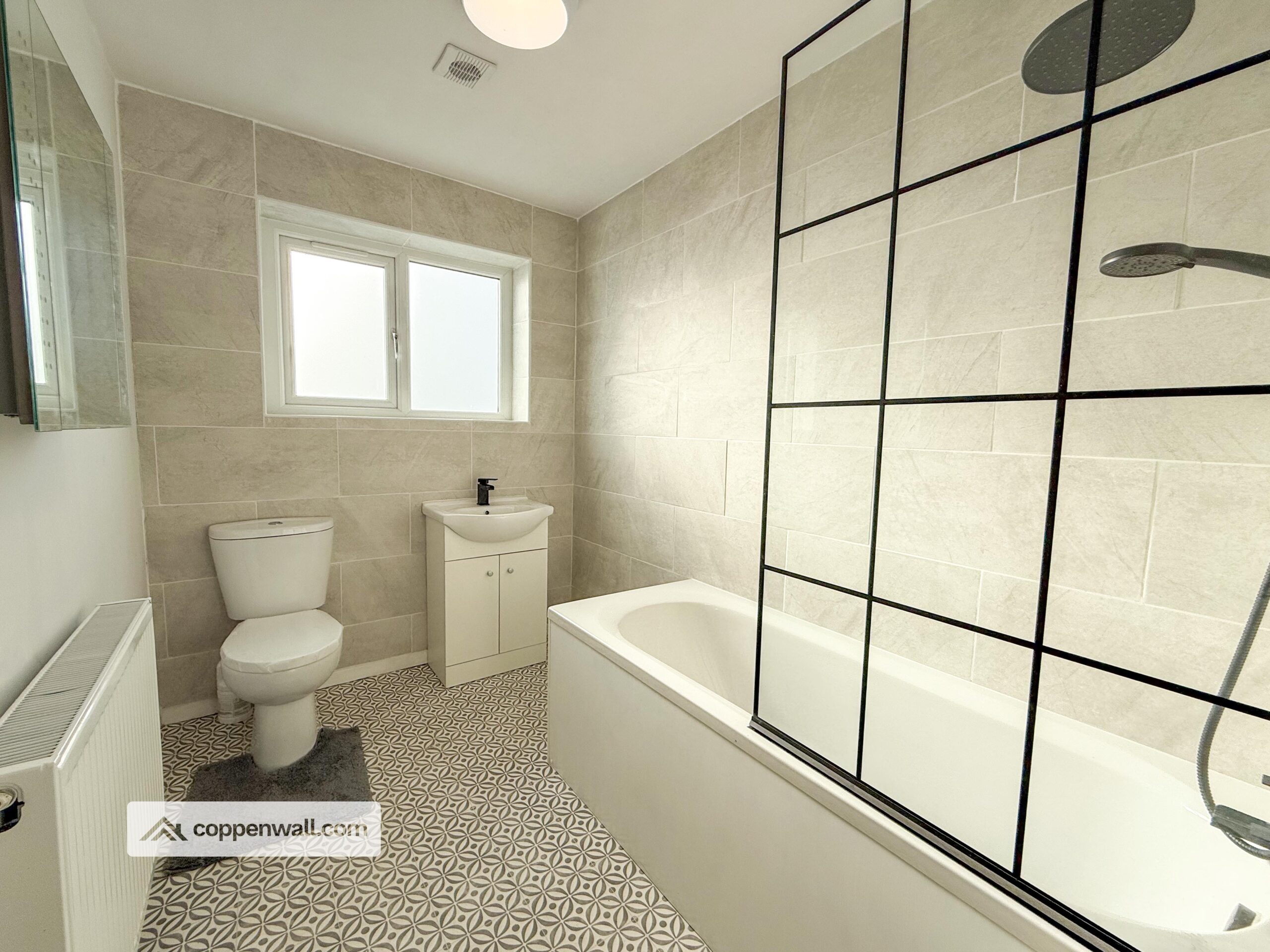 Brand new fitted bathroom suite with soft grey tiles and modern Matt black bathroom fittings.