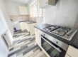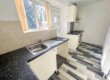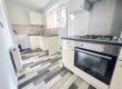 fitted with range of base and wall units with cream-coloured gloss finished flush panelled doors with chrome handles and contrasting black mottled working surfaces, oyster coloured tiled splashbacks, integrated electric oven and four ring gas hob with chimney style extractor hood over all in stainless steel finish, inset stainless steel sink with lever operated mixer tap, space for automatic washing machine, space for tall fridge freezer, window and door to private rear yard, attractive vinyl flooring, ceiling spotlighting.