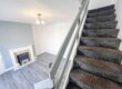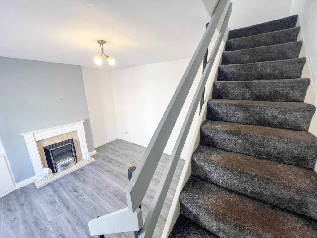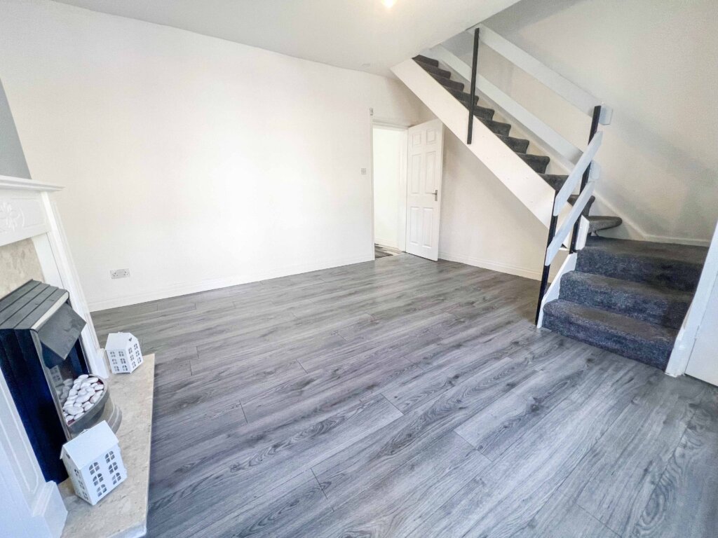The spacious room consists of a chrome finished coal effect electric fire set within a mahogany effect surround, double glazed window to front, staircase rising to the first floor, modern panelled door leading to the kitchen.
