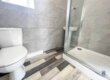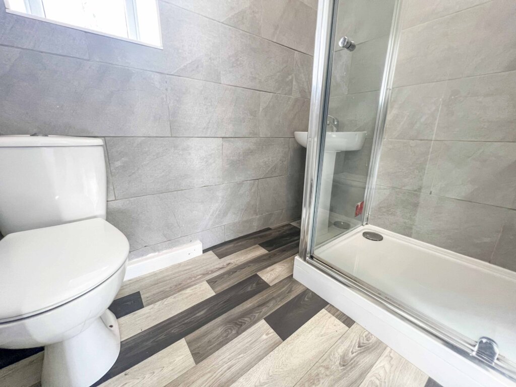 Frosted window with corner shower, low level WC with matching pedestal sink.