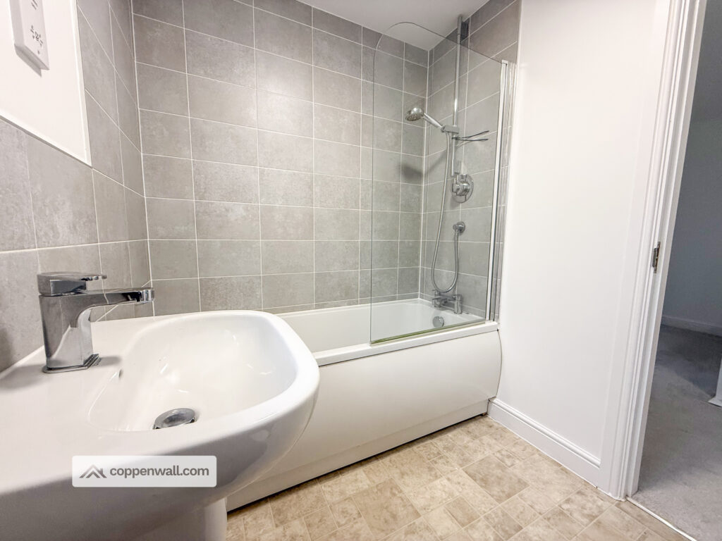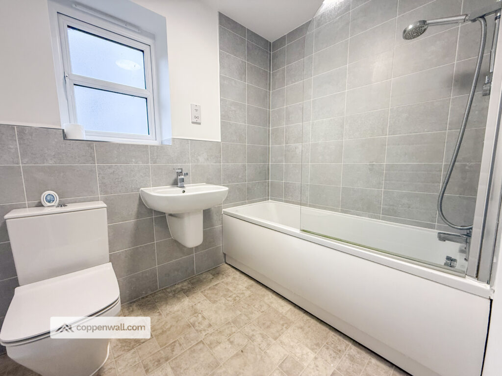 Fitted with a three-piece suite comprising a panel bath with mixer tap and overhead direct feed shower, dual-flush WC, and wall-mounted wash basin with mixer tap. Finished with partially tiled elevations, extractor fan, shaver point, vinyl flooring, and UPVC double-glazed frosted window.