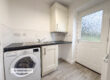 A practical utility room fitted with a base unit, complementary work surface, tiled splashback, inset stainless-steel sink and drainer, enclosed boiler, and plumbing for a washing machine. Finished with wood-effect flooring and providing access to the WC and rear garden via a composite double-glazed frosted door.