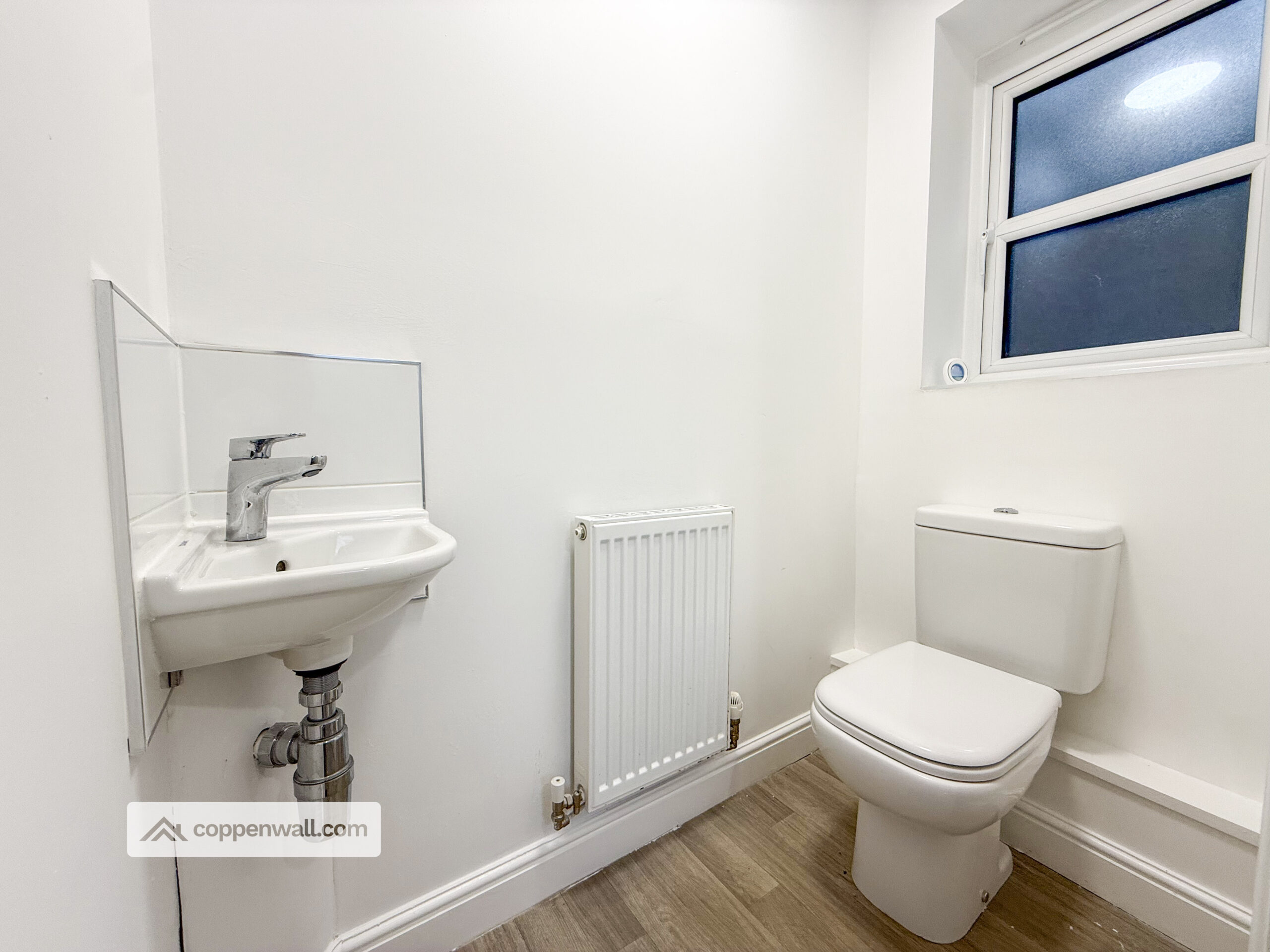 Fitted with a dual-flush WC and wall-mounted wash basin with mixer tap. Also features a central heating radiator, tiled splashback, wood-effect flooring, and UPVC double-glazed frosted window.