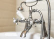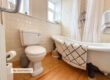 Modern freestanding bath with shower over bath, low level wc, and wash basin.