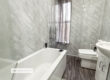 UPVC double glazed frosted window, heated towel rail, vanity wash basin with mixer tap, panelled bath with mixer tap and direct-feed rainfall shower, dual flush WC, spotlights, marble-effect panelling, and wood-effect lino flooring.