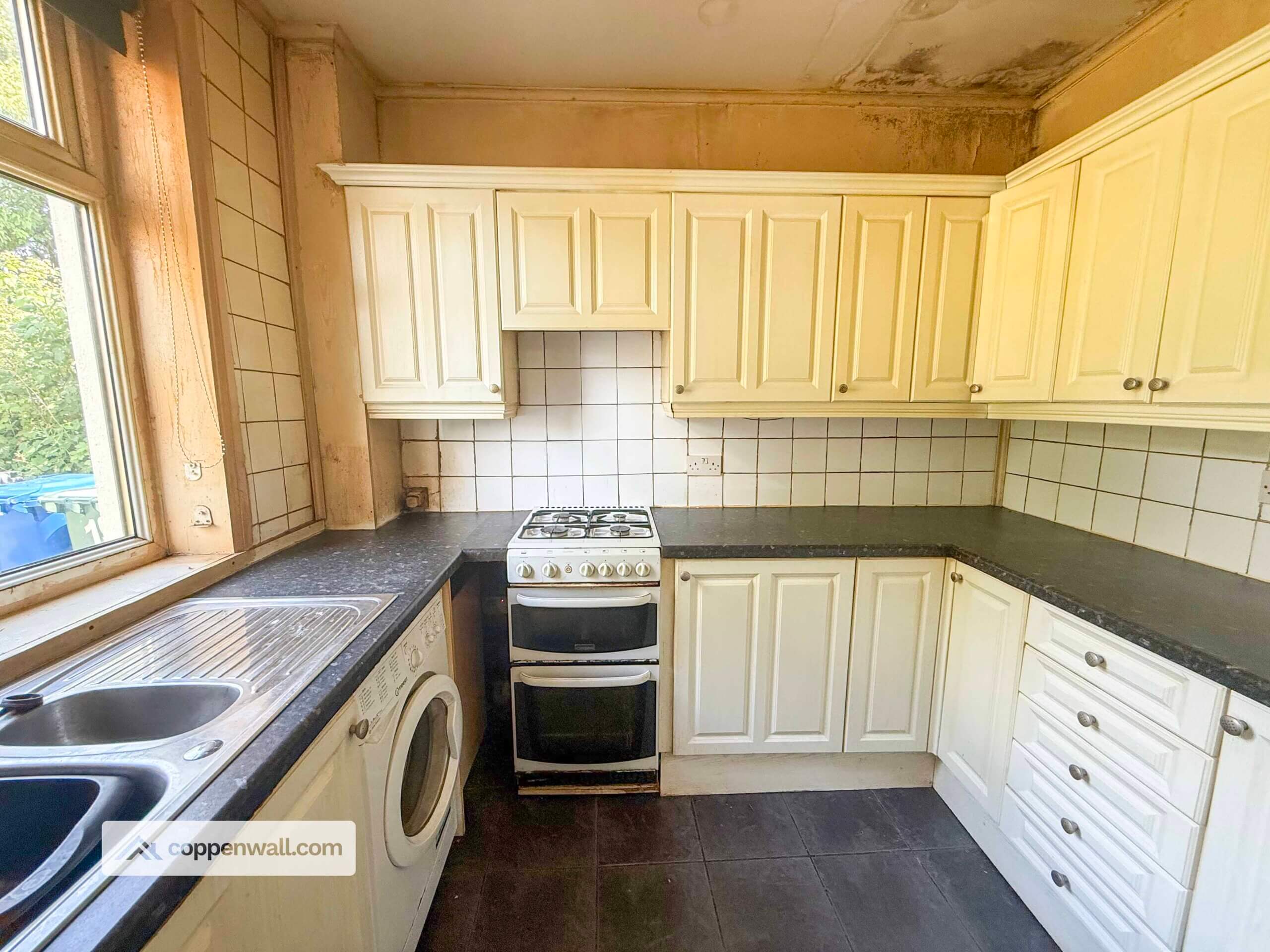 KITCHEN - The Kitchen requires an overhaul but is in usable condition with white/cream cabinetry and a rear aspect window.