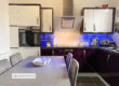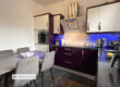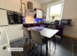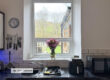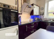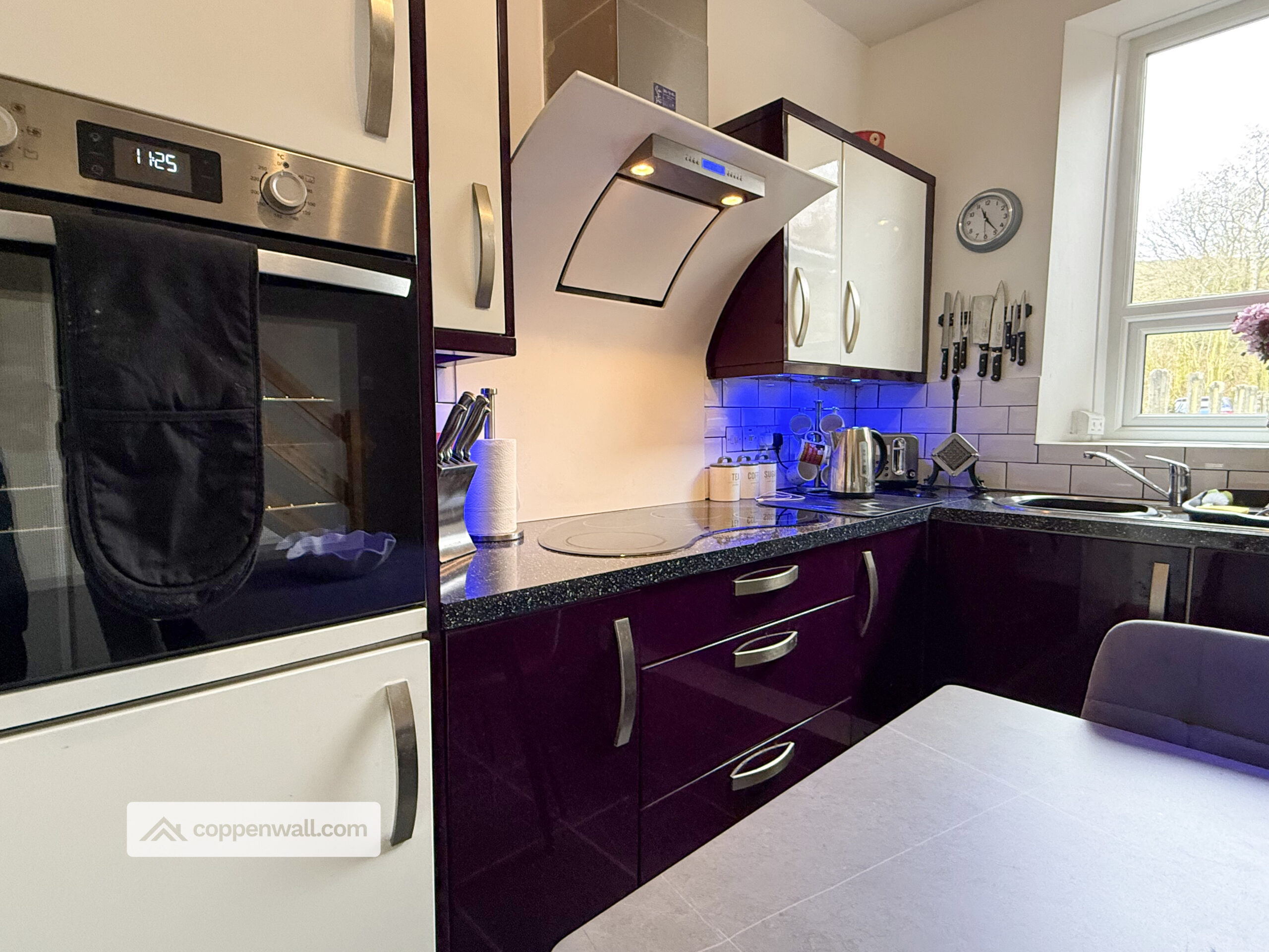 This contemporary dining kitchen features sleek plum and gloss white cabinetry complemented by built-in appliances. The oven, installed just three months ago, sits alongside an electric hob, with delightful views overlooking the rear garden and the countryside beyond.