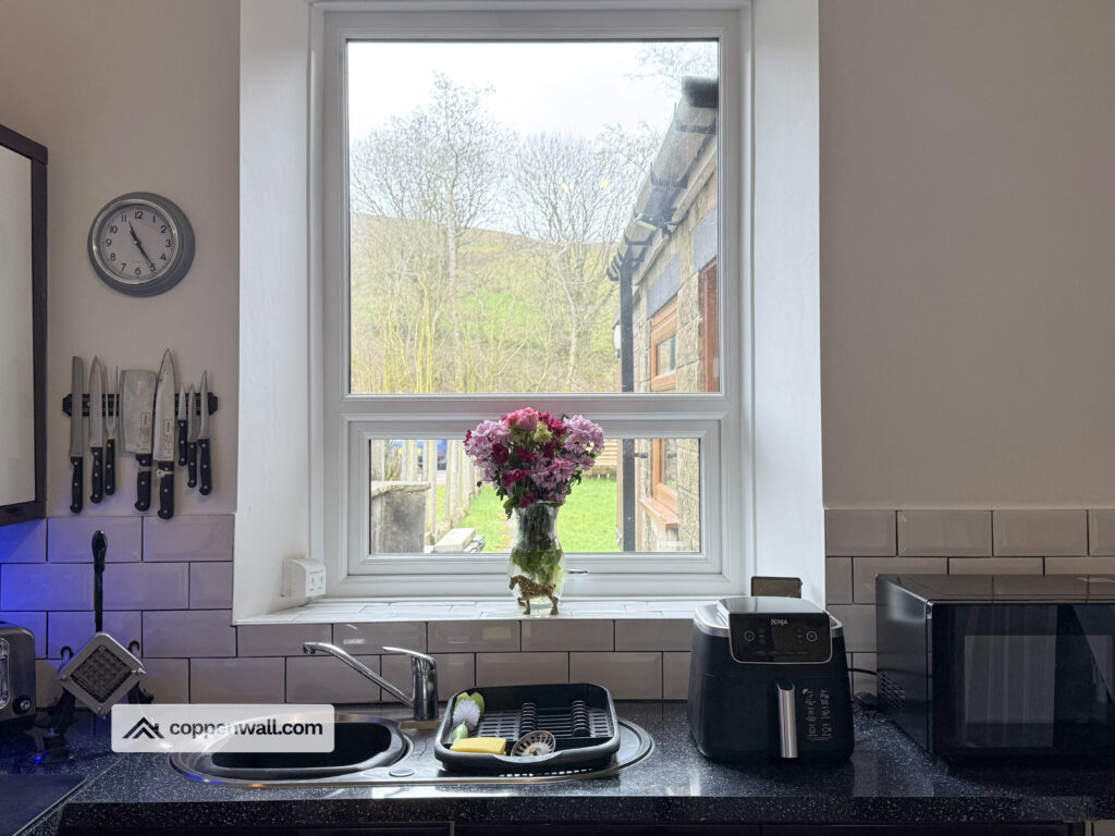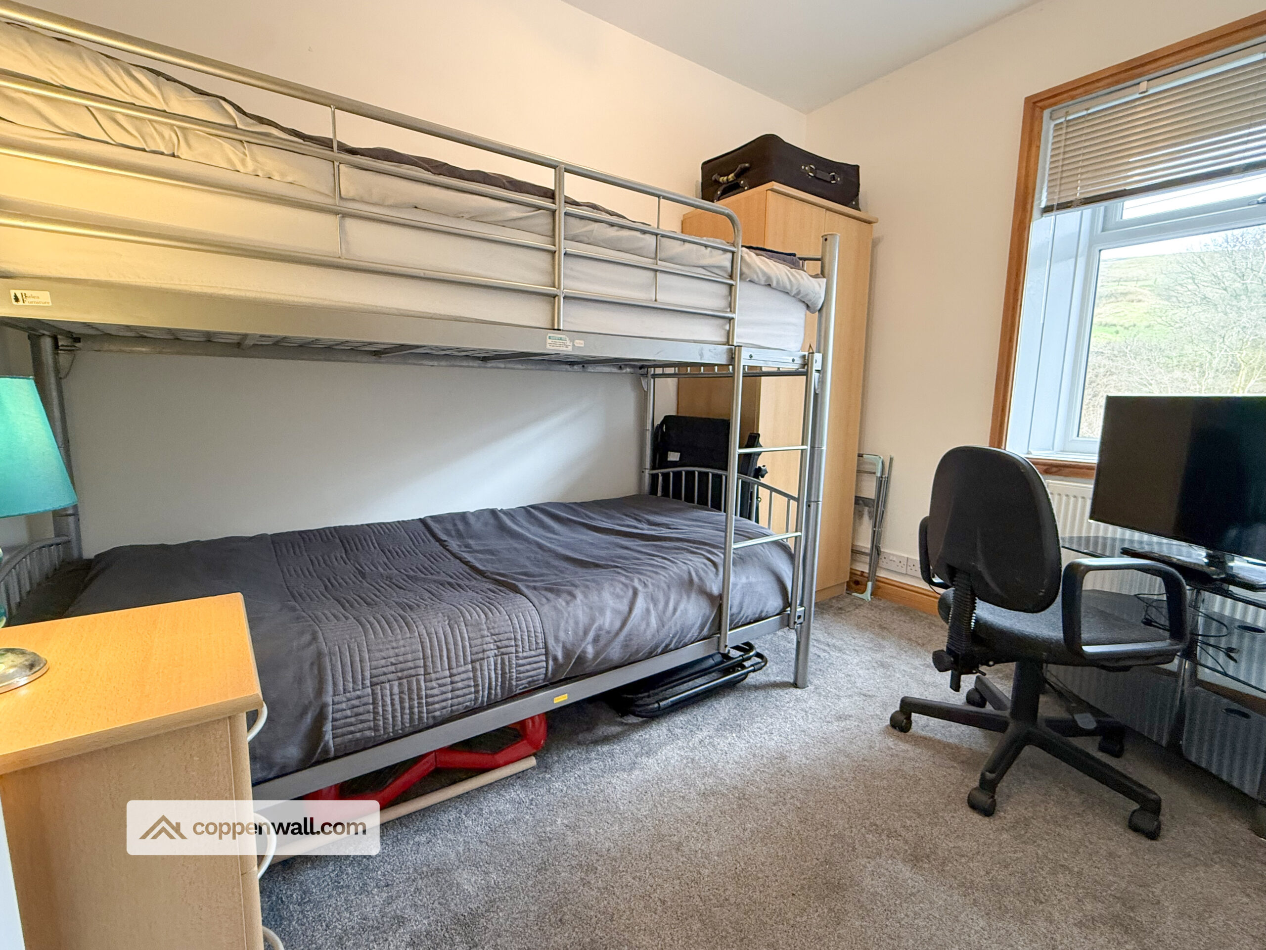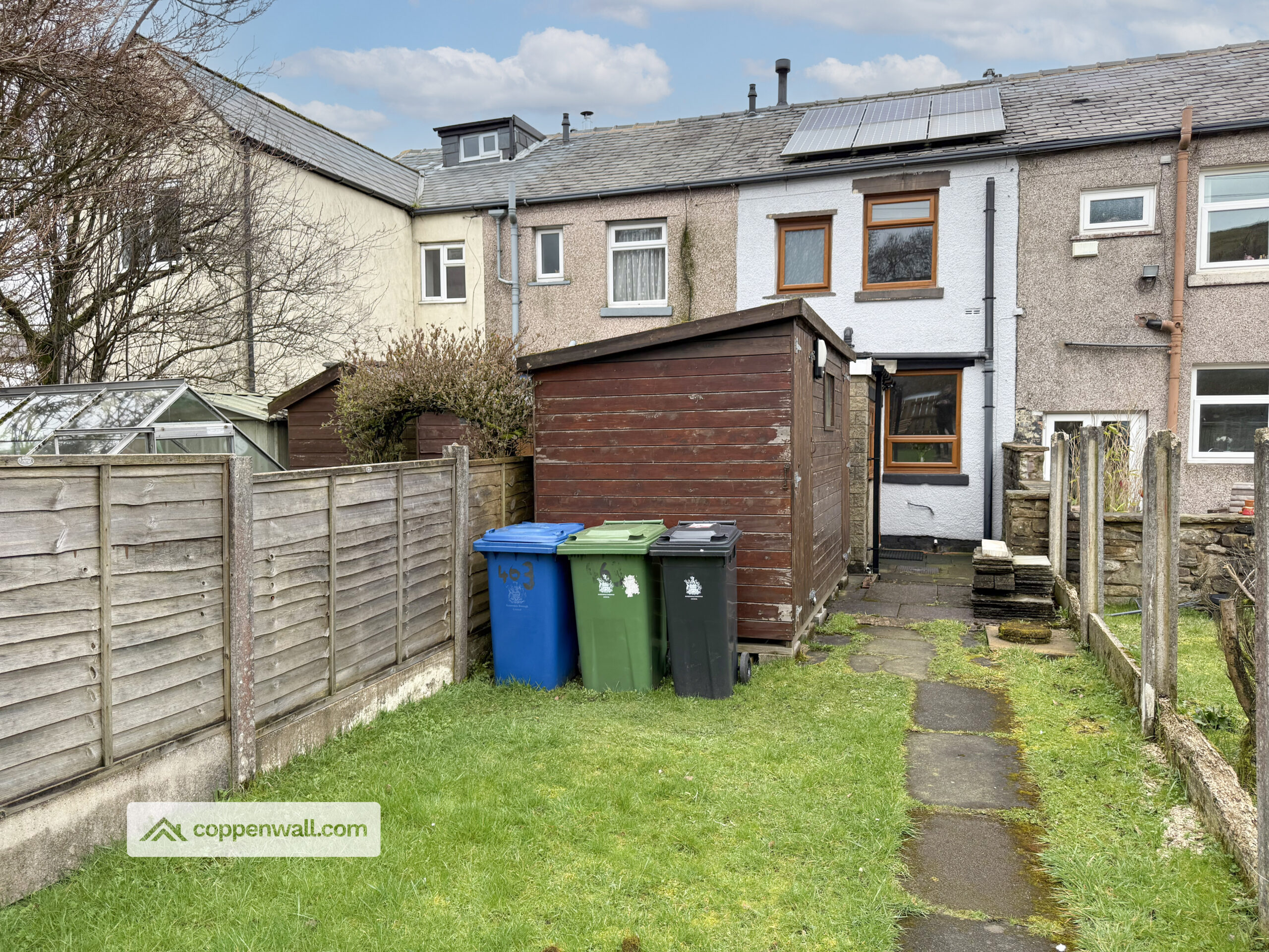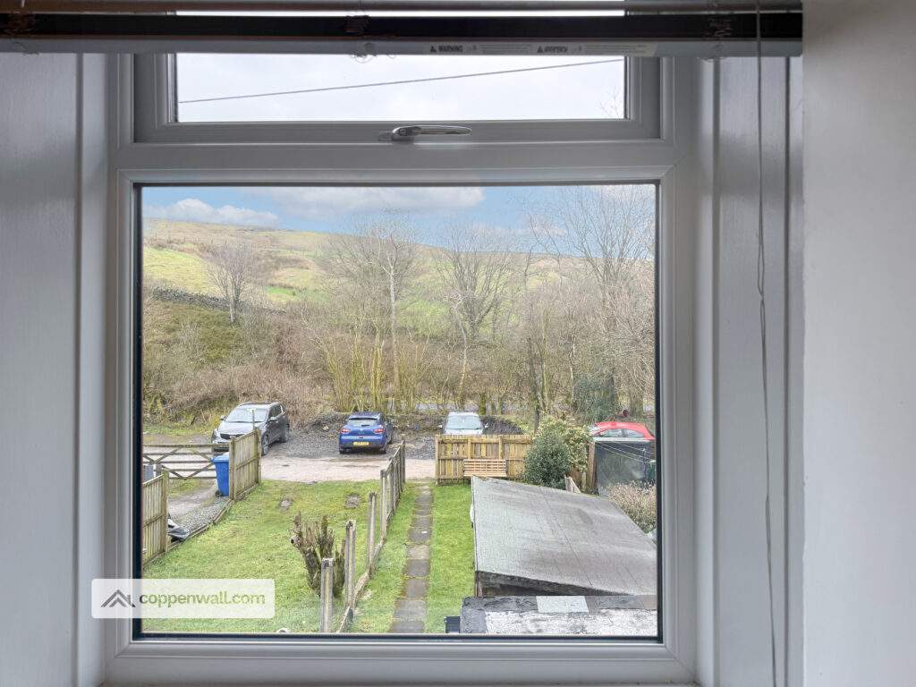 The rear garden benefits from an outside tap and a wooden storage shed, creating a private outdoor space. Although parking is available at the rear, it is not owned with the property. A footpath at the back leads directly to New Line Reservoir, an ideal location for jogging, dog walking, or simply enjoying the great outdoors.