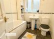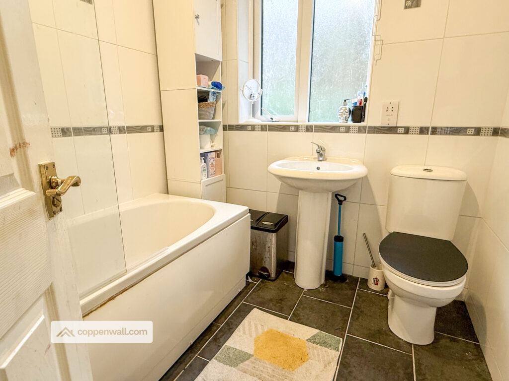 Family Bathroom - Modern three piece suite in white comprising toilet, sink and bath with shower over and shower screen, tiled floor, heated towel rail fitted, fitted spotlights, shaver point, uPVC double glazed window to rear.