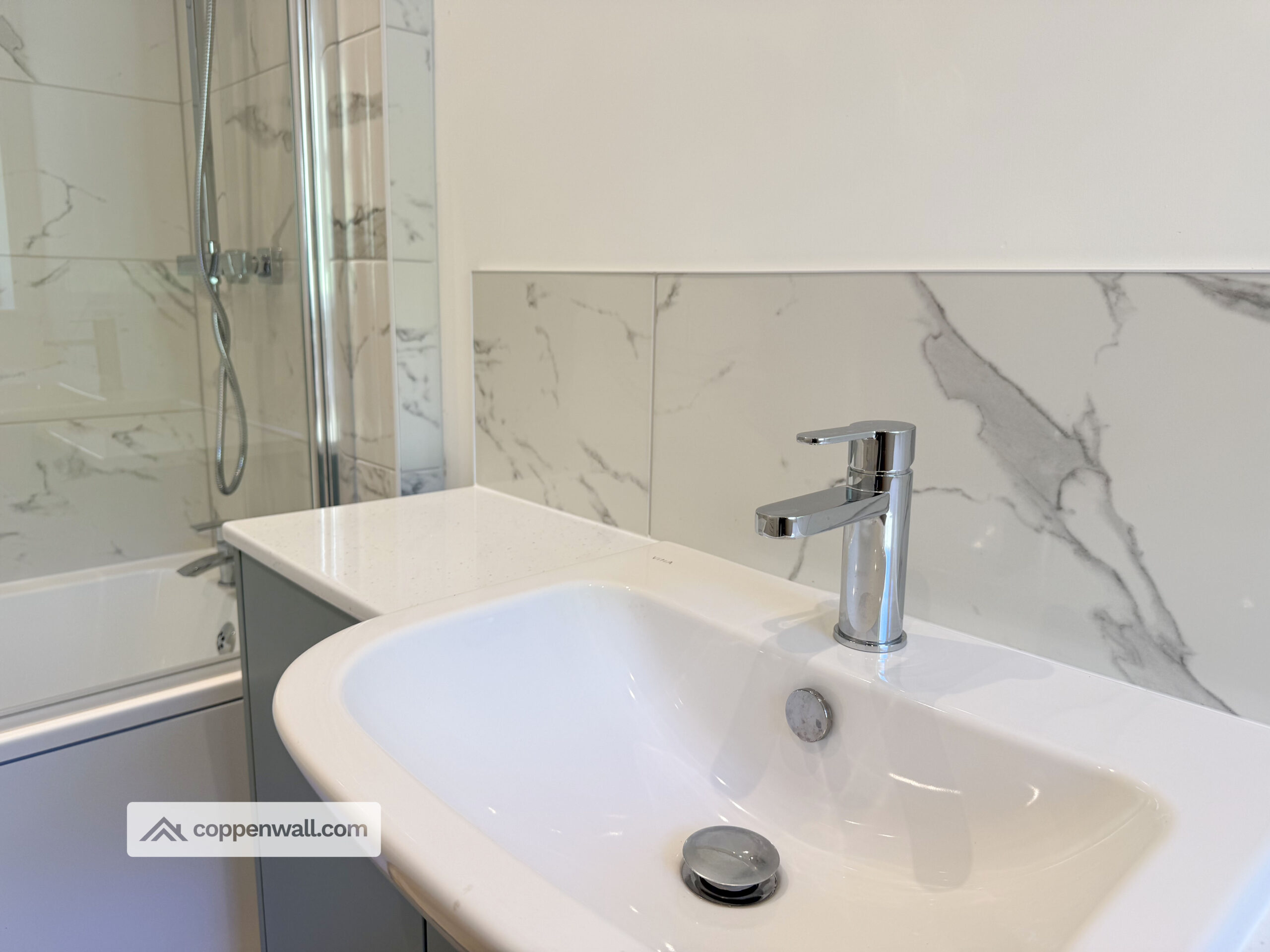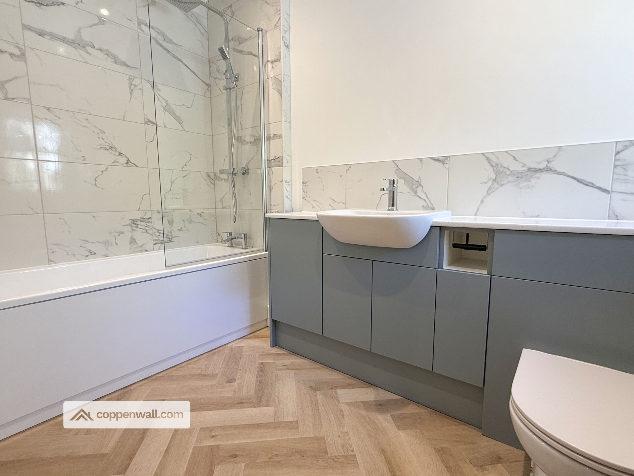 With a newly fitted three-piece suite including bath with shower over, wash basin, and WC, finished in a clean, modern style.