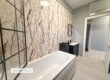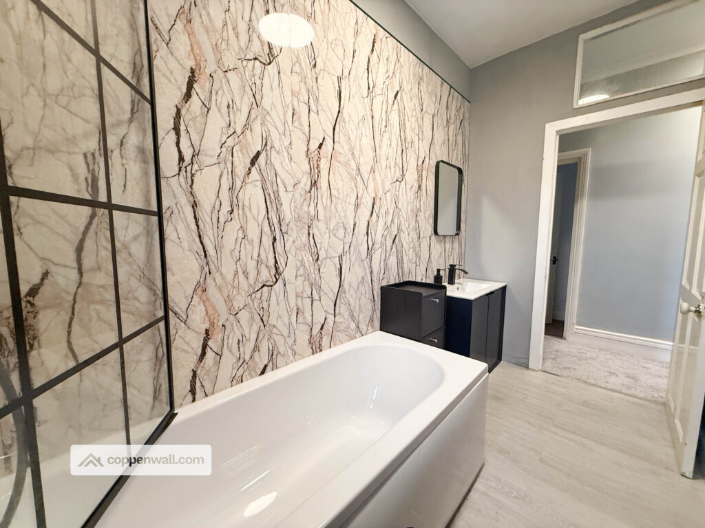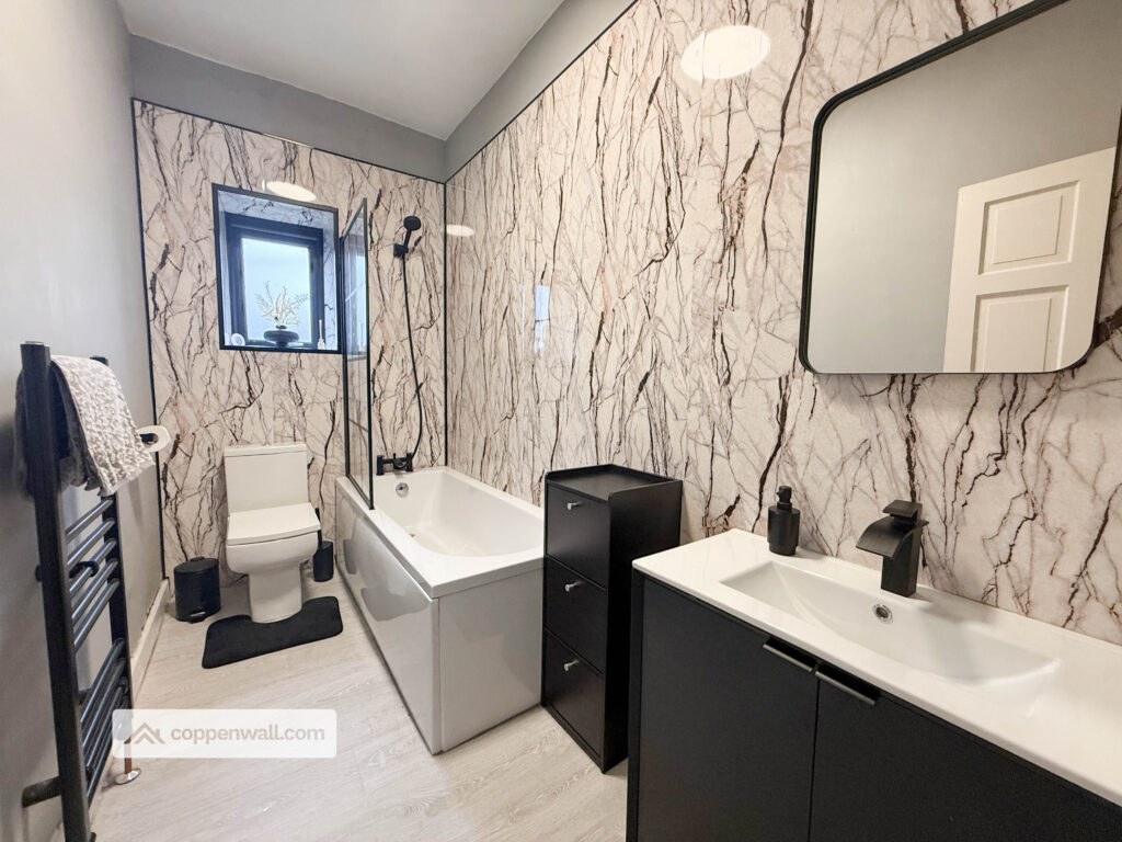 A modern and stylish bathroom fitted with a contemporary three-piece suite comprising bath with shower over and glass screen, WC and vanity wash basin. Finished with striking marble-effect wall panels and contrasting black fittings, creating a sleek and high-end finish.