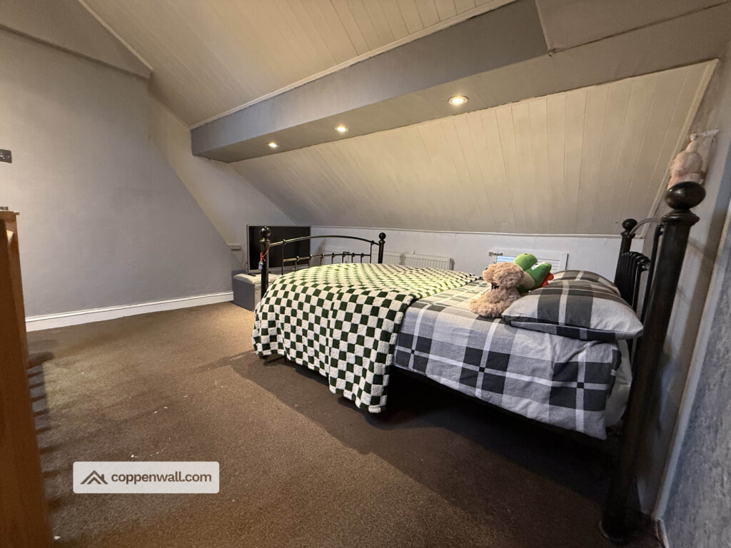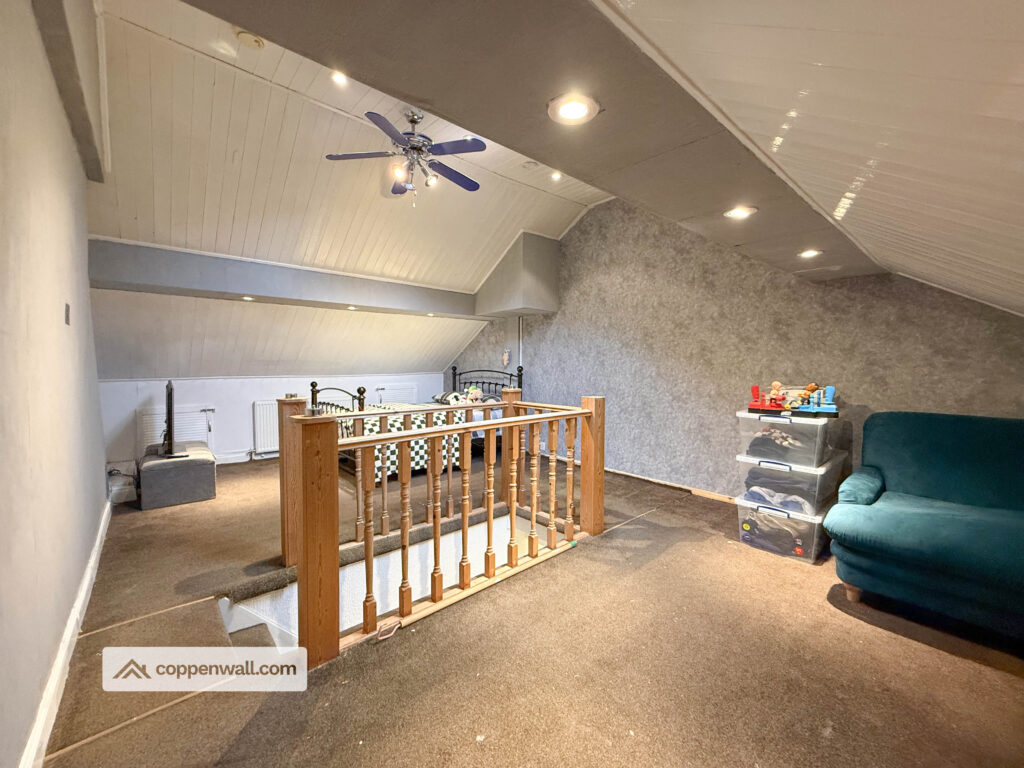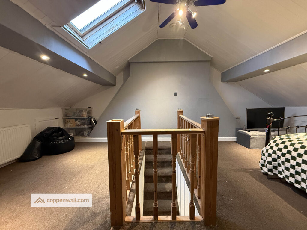 An impressive and spacious bedroom with skylight window allowing natural light to flood the room. This versatile space could serve as a large third bedroom, home office, or hobby room, and offers potential to be reconfigured to create additional accommodation if required.