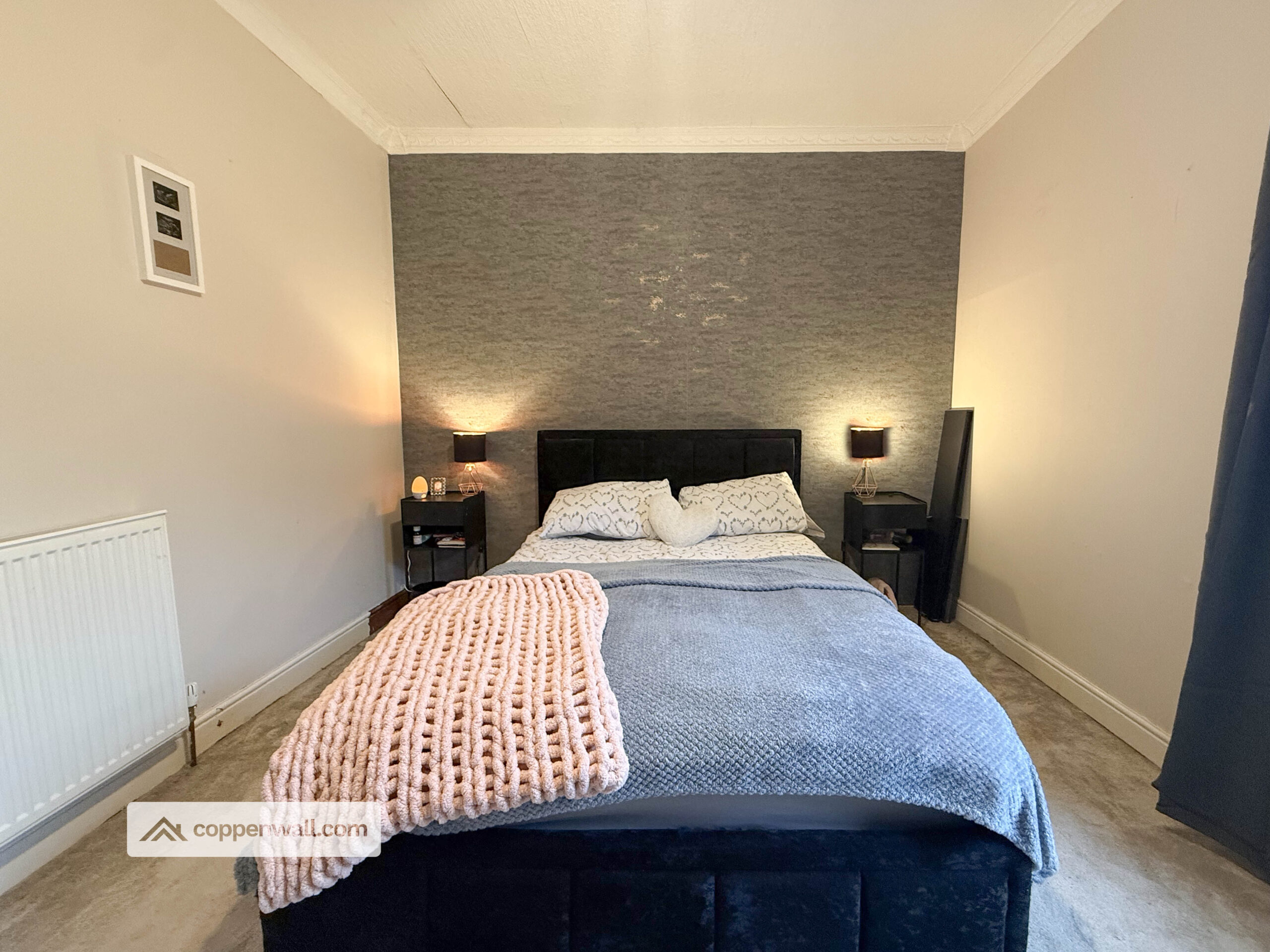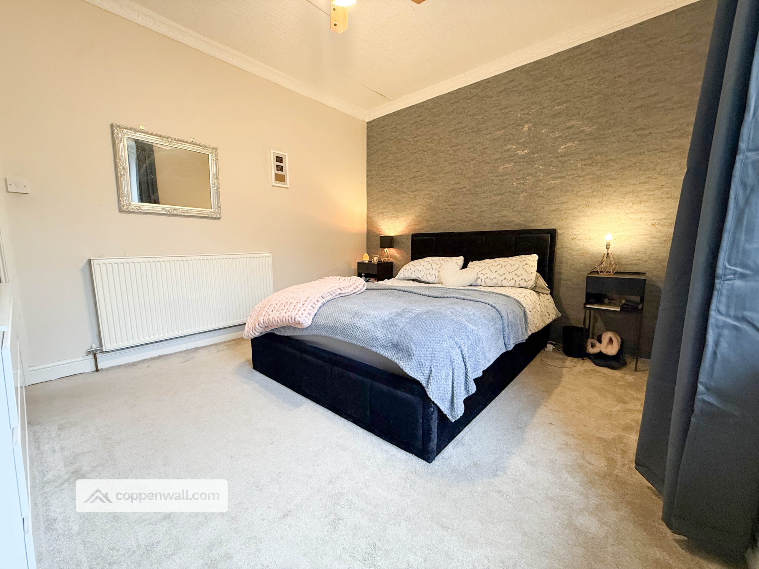 A generous double bedroom beautifully presented with feature wall décor and ample space for wardrobes and bedroom furniture. A bright and comfortable retreat.