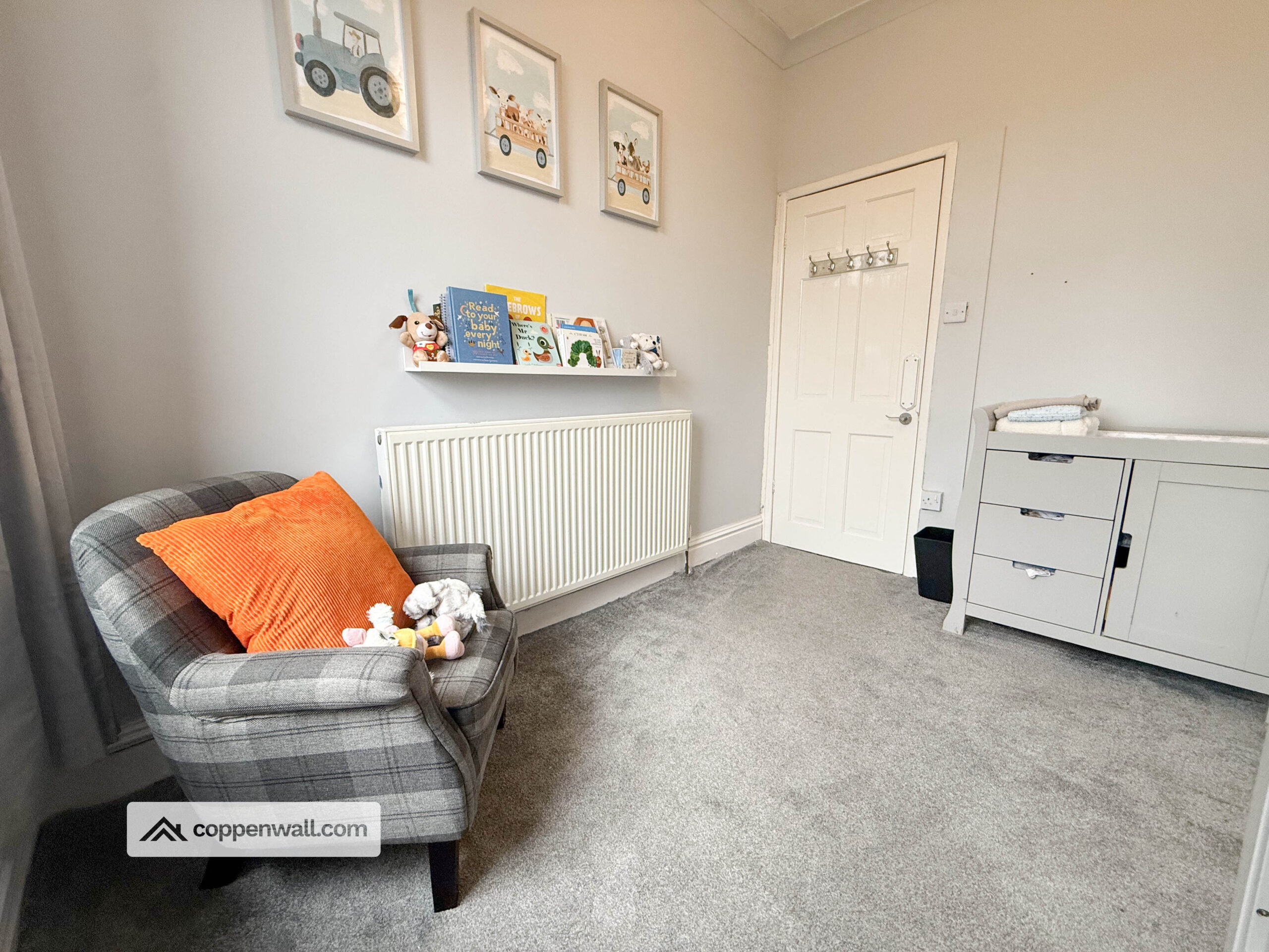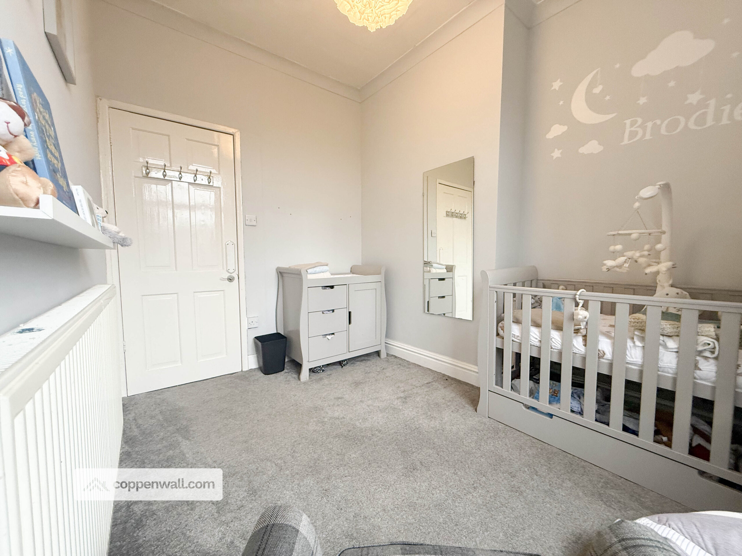 A well-proportioned second bedroom currently used as a nursery, ideal as a child’s bedroom, guest room or home office. Neutral décor and good natural light enhance the space.