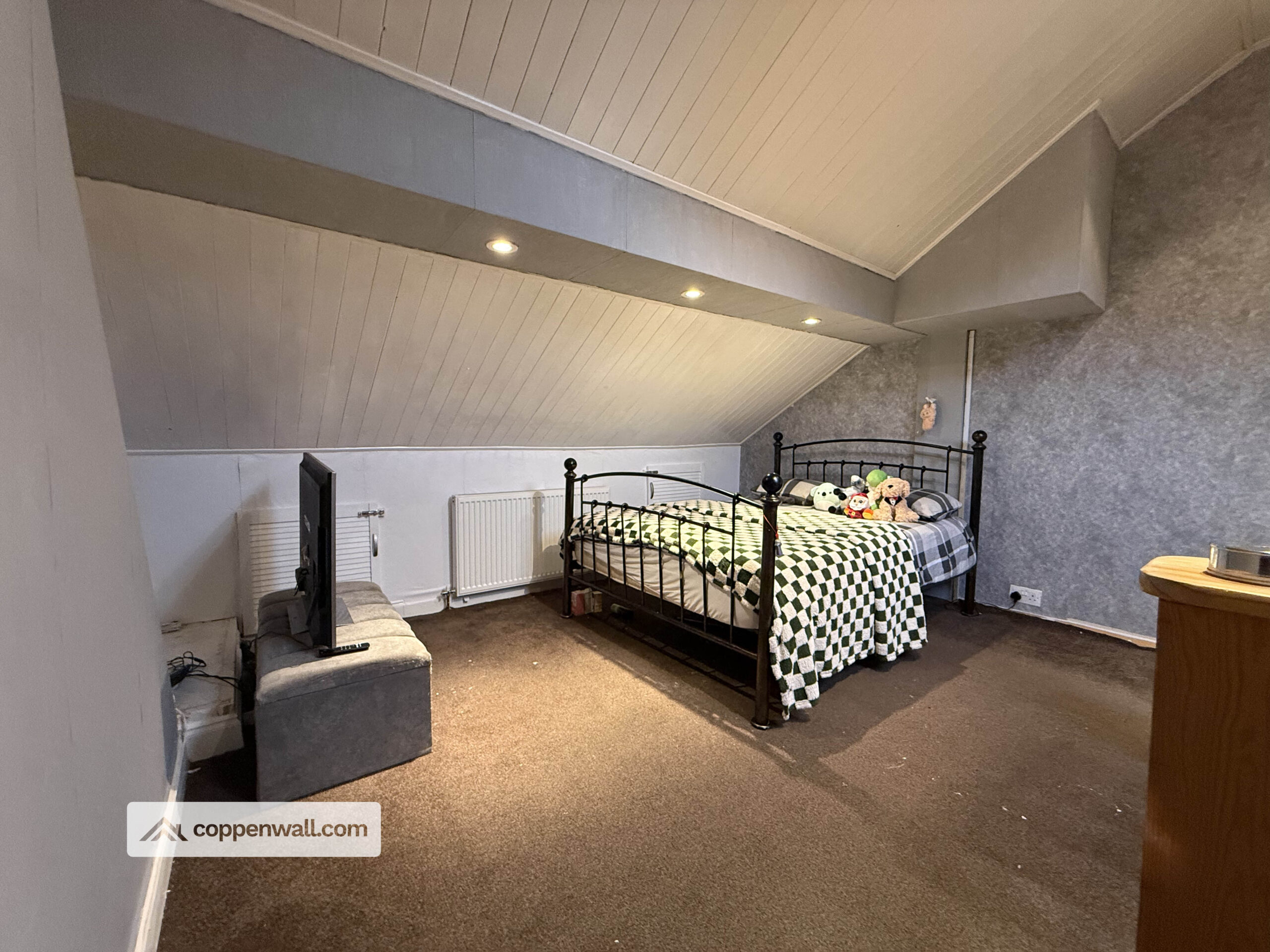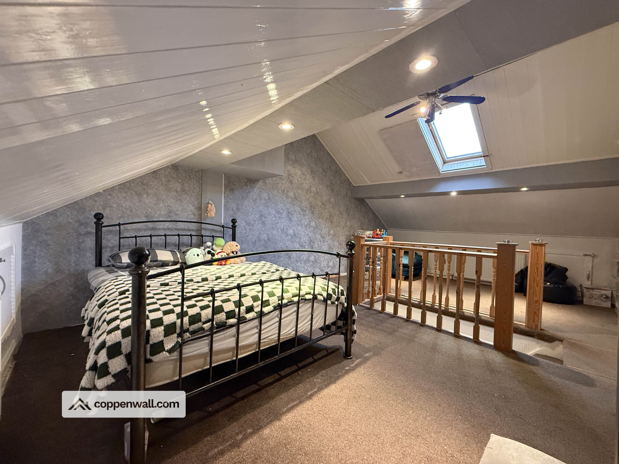 An impressive and spacious bedroom with skylight window allowing natural light to flood the room. This versatile space could serve as a large third bedroom, home office, or hobby room, and offers potential to be reconfigured to create additional accommodation if required.