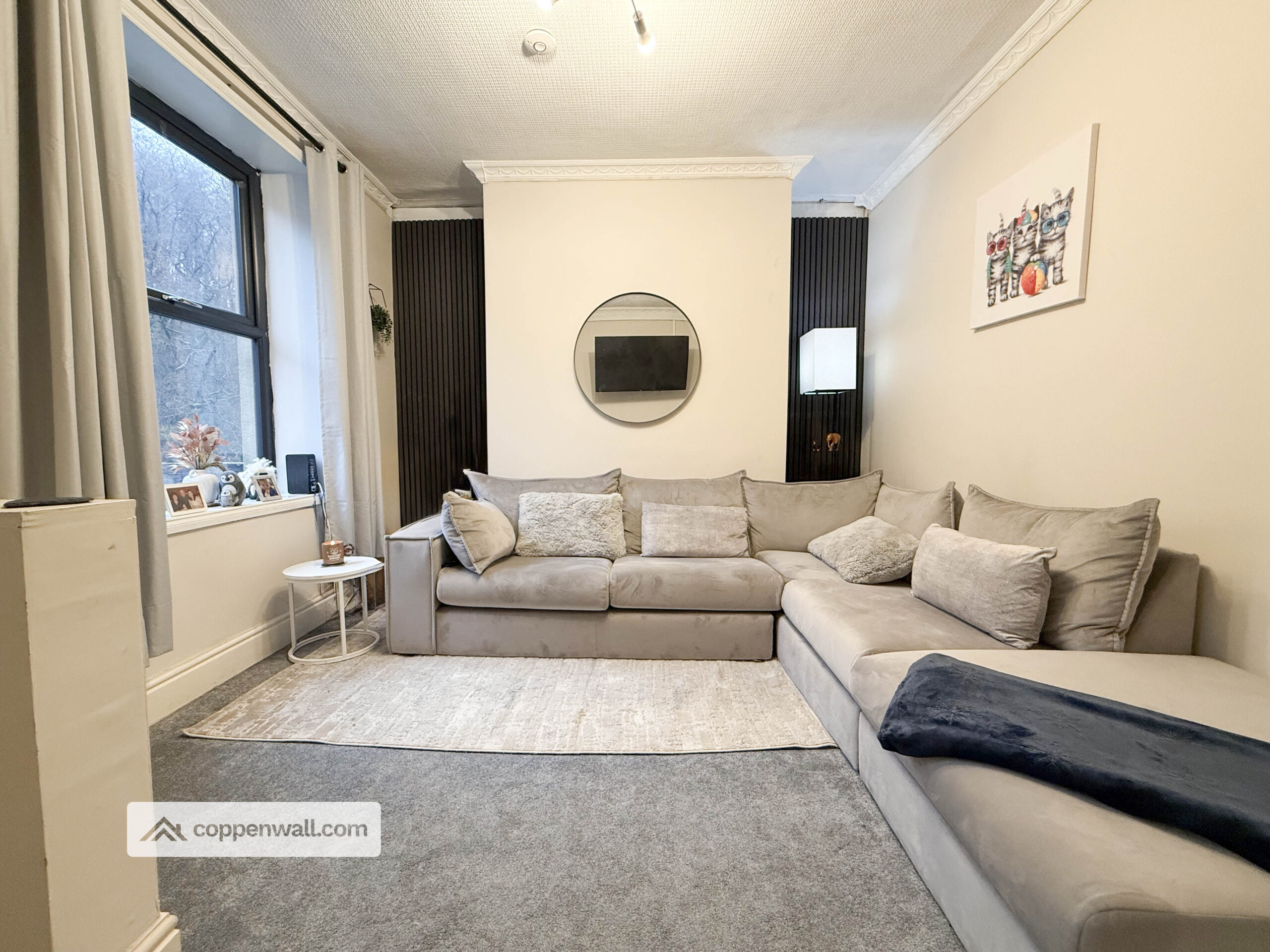 A stylish and inviting main reception room featuring modern décor, feature wall panelling and a contemporary colour scheme. The space comfortably accommodates a large sofa suite and additional furniture, creating a warm and cosy yet spacious living area. A large front-facing window allows for plenty of natural light.