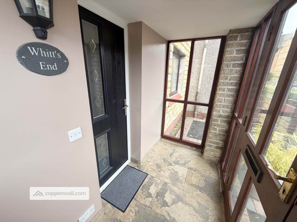 Glazed entrance porch with tiled flooring ideal for coats, shoes, and prams giving a sheltered welcome before the inner hall.