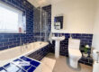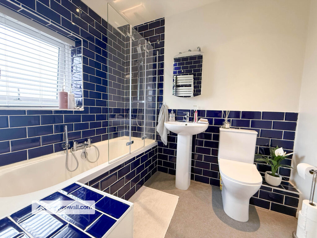 Stylish three-piece suite with tiled bath and shower over with glass screen, pedestal wash basin and WC. Finished with striking navy metro tiling and a heated towel rail for a modern feel.