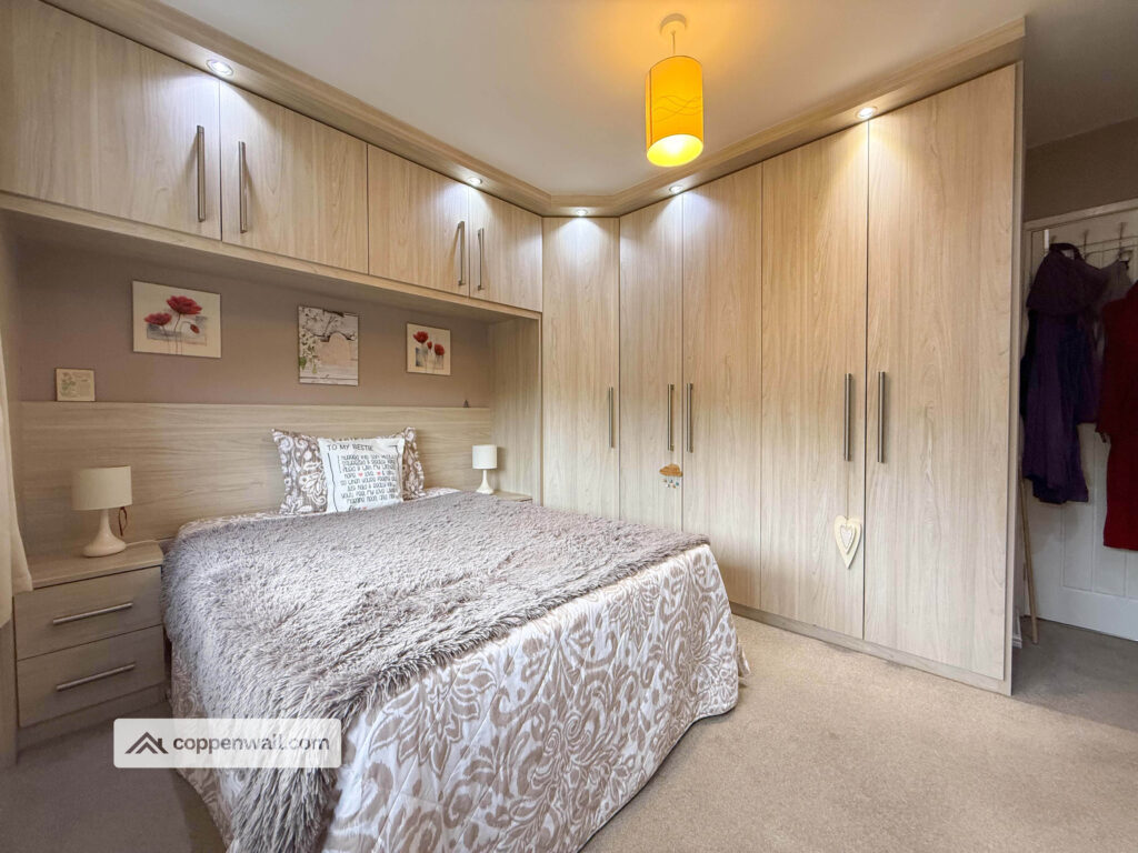 A generous double enhanced by a wall of quality fitted wardrobes with overhead storage and built-in spotlights.